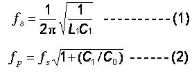 在評估共振時的等效線路時, 串聯(lián)諧振頻率及并聯(lián)諧振頻率, fr and fa ,是最重要的二個頻率參數(shù). 對于串聯(lián)諧振頻率及并聯(lián)諧振頻率( fs and fp )二者的關(guān)系, 我們可以用下列公式來表達: