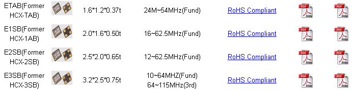 諧振器HCX-2SB2520,HCX-1AB2016,HCX-TAB1612晶振小型貼片石英晶振主要采用了,先進的晶片的拋光工藝技術,是晶體行業(yè)中石英晶片研磨技術中表面處理的最高技術,最終使晶片表面更光潔,平行度及平面度更好,大大的降低諧振電阻,使精度得到了很大的提升.改變了傳統(tǒng)的生產(chǎn)工藝,使產(chǎn)品在各項參數(shù)得到了很大的改良.,外觀尺寸具有薄型表面貼片型石英晶體諧振器,特別適用于有小型化要求的市場領域,比如智能手機,無線藍牙,平板電腦等電子數(shù)碼產(chǎn)品