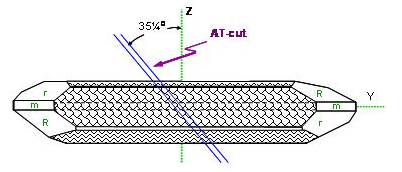 在各種不同種類的切割角度方式中, AT角度切割的石英芯片適用在數MHz到數佰MHz的頻率范圍,是石英芯片應用范圍最廣范及使用數量最多的一種切割應用方式. 在(如圖)中, 從"7M-12.000MAAJ-T"石英晶棒X-軸向的上視圖, 可以看到對Z-軸向旋轉約35度的AT 方向. 這在大量生產的技術上也是很好達成的一種作業方式.