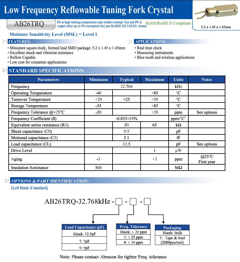 | AB26TRQ-32.768KHZ-T | Abracon LLC | AB26TRQ | kHz Crystal (Tuning Fork) | 32.768kHz | Cylindrical Can, Radial | 0.264" L x 0.059" W (6.70mm x 1.50mm) |