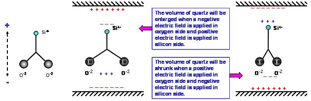 氧原子的水平位置變化時, 鄰近的另一個氧原子會相對的產生排斥或吸引的力量, 迫使氧原子回到原來的空間位置. 因此, 電場的力量與原子之間的力量會相互牽動, 電場的改變與水平方向的形變是形成交互作用狀態. 這個交互作用會形成一個在石英材料耗能最小的振動狀態, 祇要由電場持續給與能量, 石英材料"9HT11-32.768KAZF-T"就會與電場之間維持一個共振的頻率. 這個壓電效應下氧原子的振幅與電場強度及電場對二氧化硅的向量角度有相對應的關系.在實際的應用上, 電場是由鍍在石英芯片上的金屬電極產生, 電場與二氧化硅的向量角度則是由石英晶棒的切割角度來決定.