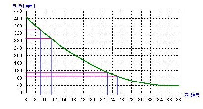 在圖中, CL=24 pF 時的頻率敏感度是10 ppm/pF, 及CL=10 pF時的頻率敏感度是20 ppm/pF. 在并聯線路中, 負載電容越小, 頻率對負載電容變化的敏感度越高. 相反的, 負載電容越大, 頻率對負載電容變化的敏感度越低. 這就是石英晶體共振子用于VCXO線路上時, 線路設計上會選用較小負載電容. 反之, 在要求較準確的頻率信號時, 線路設計上會選用較高的負載電容.