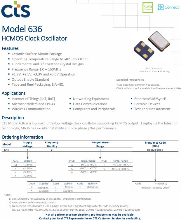 更多>>CTS編碼636L3I027M00000是一款低電壓時鐘振蕩器支持HCMOS輸出