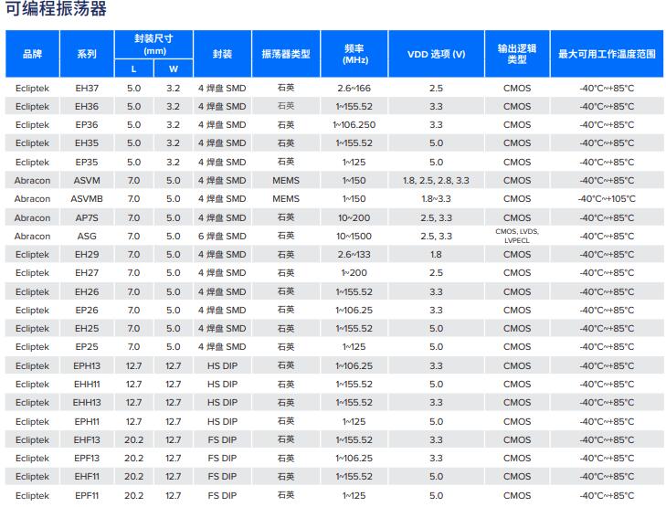 編程能力使 Abracon有源貼片晶振 和 Ecliptek 品牌能夠提供以下功能: