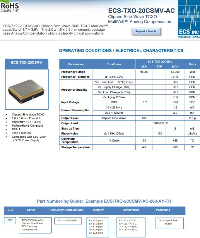 The ECS-TXO-20CSMV-AC is an analog compensated clipped sine wave MultiVoltTM TCXO offering ultra-tight stability for precision applications.