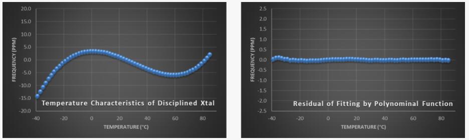 普通石英坯料可能存在輕微的缺陷或雜質(zhì),例如石英表面的拋光區(qū)域不足或晶坯中的晶格無序.這些微小的不規(guī)則性可能會(huì)導(dǎo)致特定溫度范圍內(nèi)的快速頻率跳躍,這不能用有限次多項(xiàng)式方程來描述.因此,TCXO溫補(bǔ)晶振的補(bǔ)償機(jī)制在這個(gè)特定的溫度范圍內(nèi)將是不準(zhǔn)確的.這種現(xiàn)象稱為“頻率擾動(dòng)”,在下面的圖4中進(jìn)行了可視化.