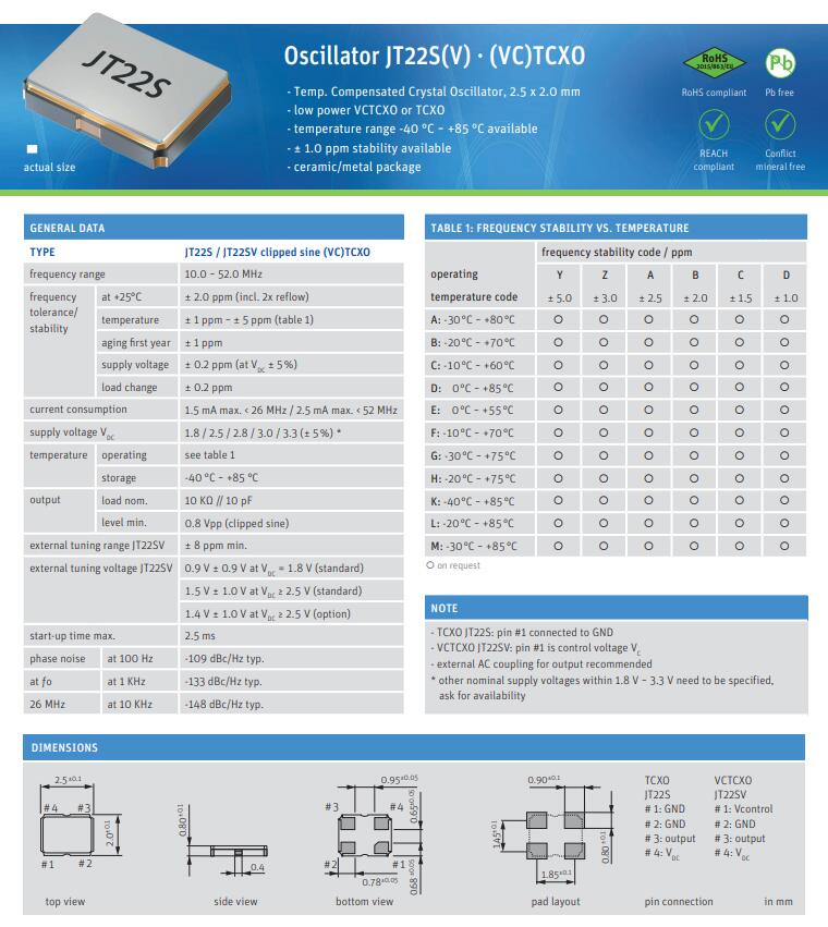 | O 26,0-JT22S-B-K-3,3-LF | Jauch Quartz | XTAL OSC TCXO 26.0000MHZ SNWV | TCXO | 削峰正弦波 | 3.3V | ±2ppm | -40°C ~ 85°C | 4 | 2520 |