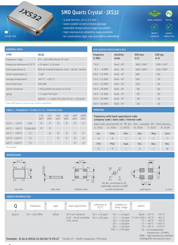 | Q 24.0-JXS32-12-10/10-FU-WA-LF | Jauch Quartz | 24MHz | ±10ppm | 12pF | -20°C ~ 70°C | 4 | 3225 |