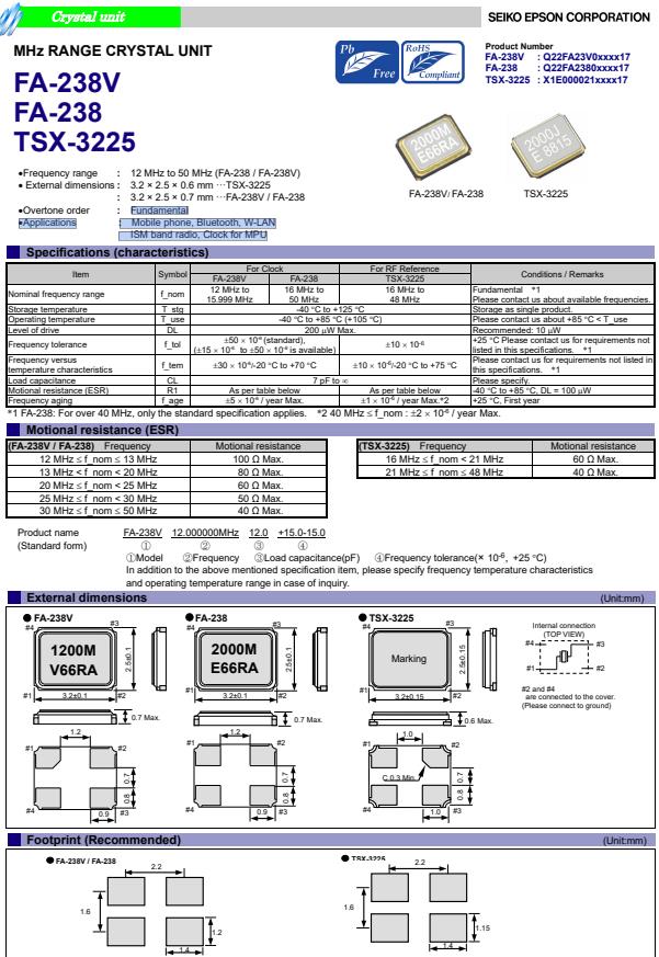 | Q22FA23V0051916 | 3.2 x 2.5 x 0.7mm | FA-238V | 12.000000 MHz | 22 pF | +/-20 ppm | +/-20 ppm | -30 to +85 °C |