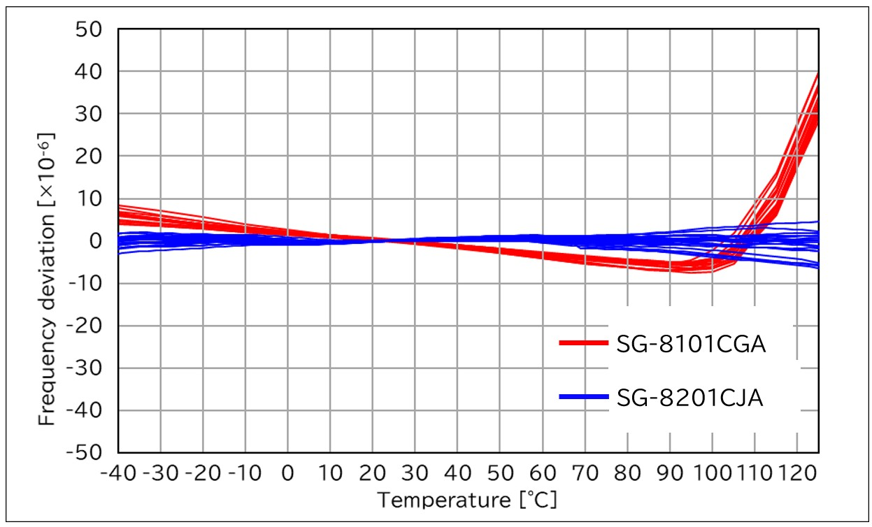 SG-8201CJA對汽車應用的貢獻1通過溫度補償功能在寬溫度范圍內(nèi)實現(xiàn)高頻率穩(wěn)定性與現(xiàn)有的SPXO石英晶體振蕩器SG-8101CGA相比,該產(chǎn)品可將溫度變化調(diào)節(jié)至+125℃,在較寬的溫度范圍內(nèi)具有高穩(wěn)定性特性.SG-8201CJA即使在各種汽車應用所需的惡劣溫度條件下(-40℃至+125℃)也能實現(xiàn)穩(wěn)定的頻率容差.■SG-8201CJA(±25x10-6/-40to+125℃)vsSG-8101CGA(±20x10-6/-40to+105℃).png)