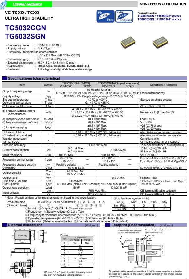 | X1G005231001500 | TG5032CGN | 20.000000 MHz | 5.00 x 3.20 x 1.45 mm | 3.135 to 3.465 V | +/-1.0 ppm | -40 to ++85 °C | +/-0.10 ppm |