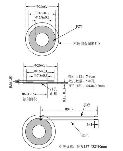 3.霧化片尺寸:(Φ16,Φ20,Φ25,厚度:1.2±0.01mm)